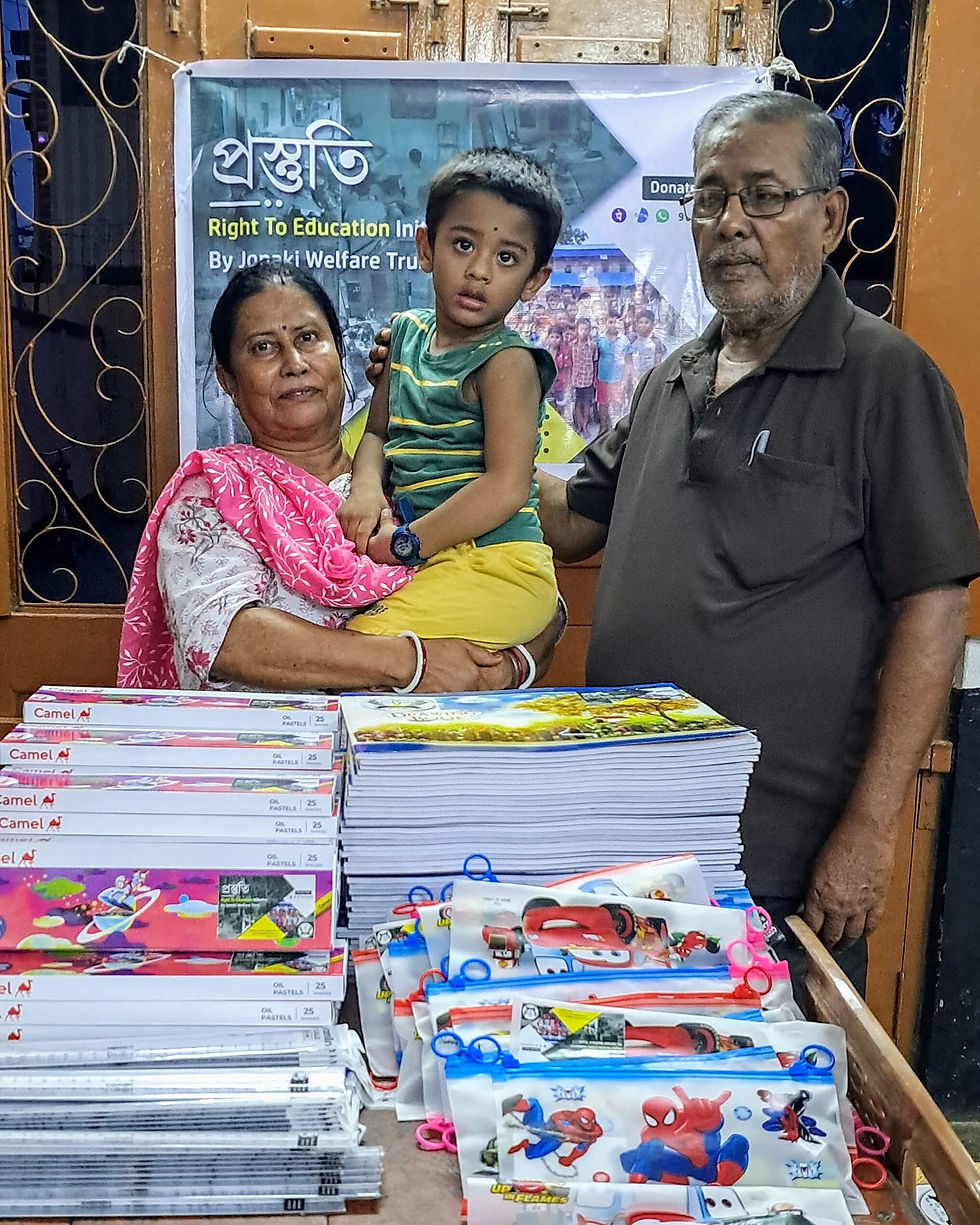 On the occasion of Ayush's birthday, team Jonaki Welfare Trust visited Sri Ramkrishna Sangha, Howrah, West Bengal, to handover Large Drawing Board, Drawing Copy (34.7 cm * 27.5 cm - 56 pages), Camel 25 Shades Oil Pastel, 12-inch Scale, 2B Pencils (2 pcs), Eraser (1 pc), Sharpener (1 pc), Pencil Bag (1 pc), Grocery Distributed - 26 Kg Rice, 4 Kg Mosur Daal, 2 Kg Soyabean, 2 L Mustard Oil, Snacks - Tiffin Cake, Frooti, to the residence of Sri Ramkrishna Sangha.